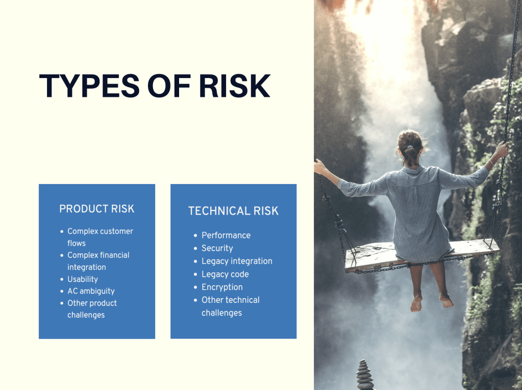 Technical Risk, as hinted in the name, refers to the technical issues that arise within performance/security, integrations with legacy code, or encryption challenges, to name a few. These are risks that aren’t necessarily called out in requirements but are identified during development planning.
