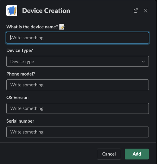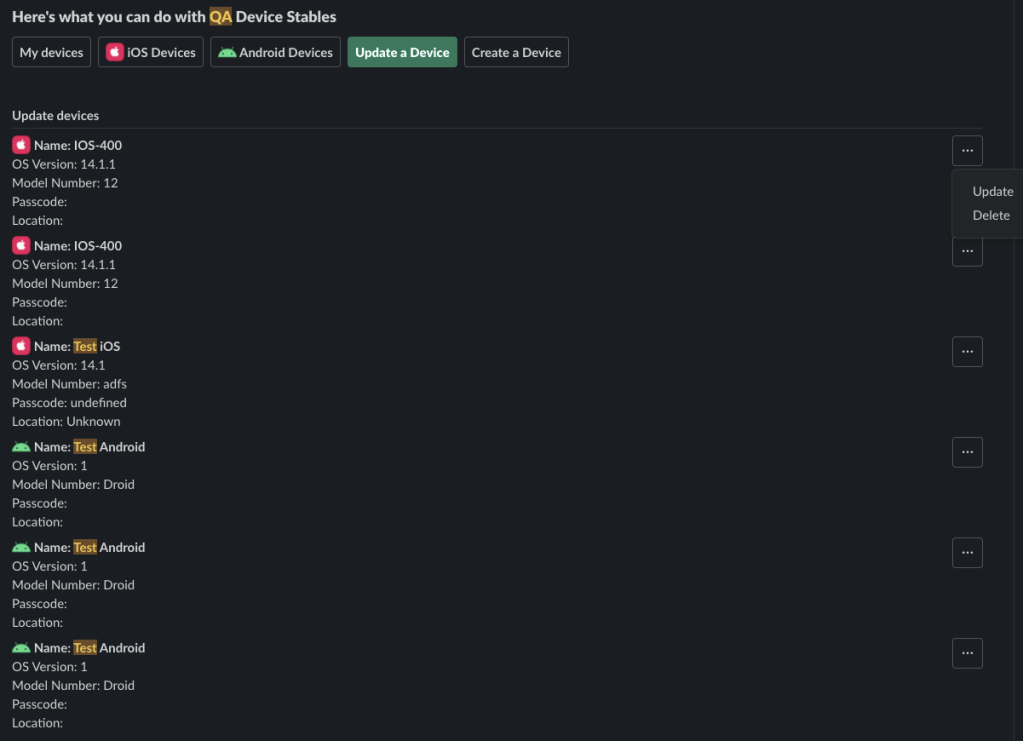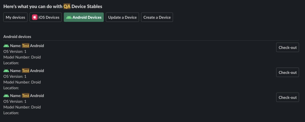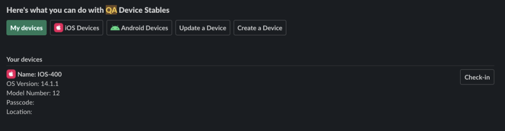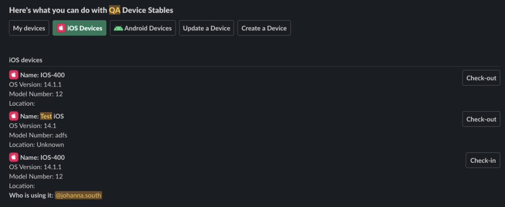 He created an App in Slack called the QA Device Stables. I’m using dummy data to showcase this work.